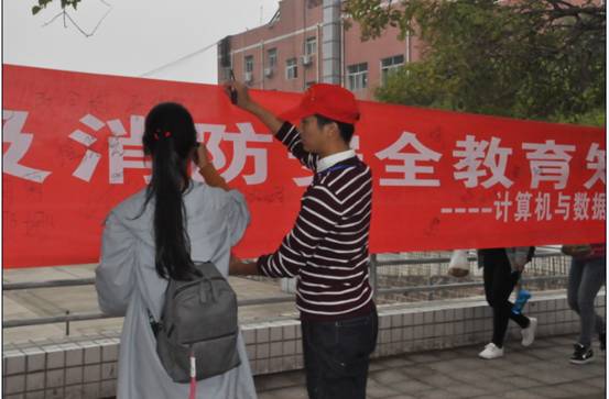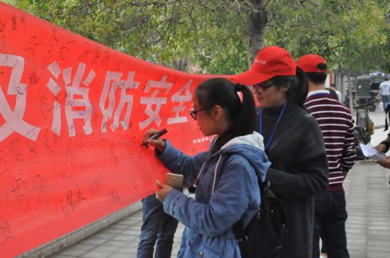 活动组织人员清点人数后,由活动负责人交代了活动的注意事项,活动正式开始。活动进行中工作人员热情的向路过的同学讲解宣传相关的消防知识、消防安全中的逃生技能,鼓励他们在宣传条幅上签名以示决心。经过整个中午的努力,条幅上遍布了同学们的签名。最后,志愿者们收拾完毕东西,负责人清点人数解散,活动圆满结束。