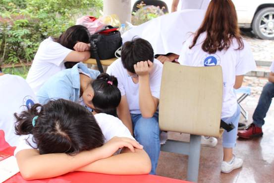 (图为志愿者们结束了繁忙的上午进行短暂的休憩)