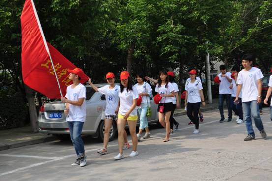 (图为志愿者们喊着响亮的口号前进)