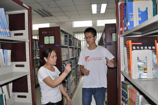 (图为图书馆负责人与志愿者交流“智慧城市”建设)