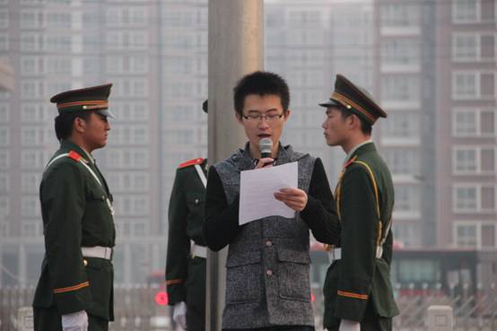 7点整,国旗班的旗手们着装整齐,迈着矫健的步伐,护着鲜艳的五星红旗入场。随着五星红旗的冉冉升起,全场师生庄严肃立,行注目礼。随后,员工代表晁德瀚同学做了国旗下的发言,他表示当代老员工作为祖国的建设者,应该积极响应党的号召,关注当代社会的核心价值观,学习和弘扬以爱国主义为核心的民族精神和以改革创新为核心的时代精神,从优秀传统文化中汲取营养,激发爱国热情。