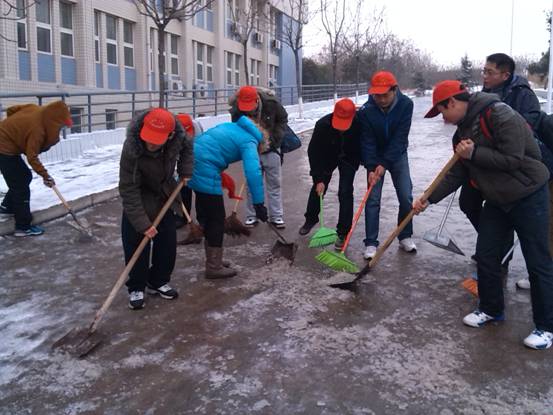 此次降雪量较大,伴随着气温骤降,道路冰冻情况较为严重。十号教学楼前结冰严重,同学们走在结冰的道路上面必须小心翼翼,否则就会滑倒。见到这种情况,计算机科学与工程系青年志愿者挥起铁锹、扫帚,在瑟瑟的寒风中清理道路。对于冰冻严重区域,用热水进行冲刷清扫。经过一个多小时的清扫,十号教学楼及周边道路可以畅行无阻。