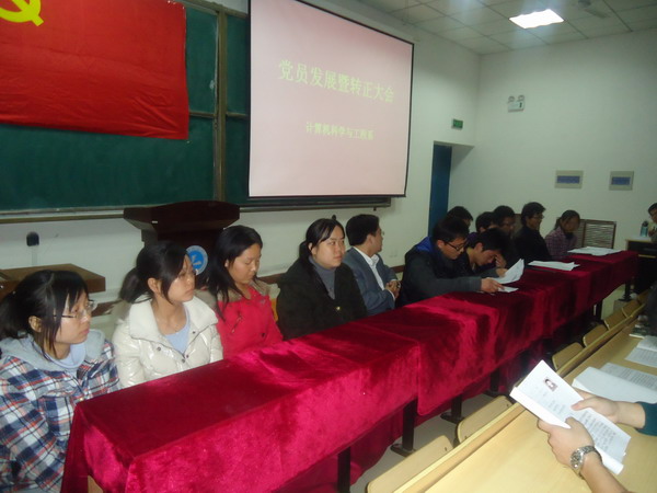 2010年12月21日18:30,计算机科学与工程系党总支员工党支部在十号教学楼B105召开党员发展暨转正大会。大会的主要议题是讨论本系48位同志的入党问题以及43位同志的转正问题。计算机科学与工程系员工党支部正式党员52名、预备党员113名和发展对象48名,共165人参加本次会议。