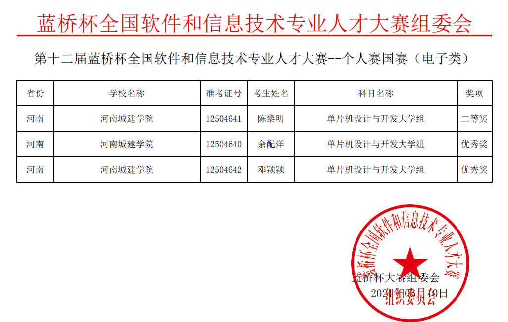 (通讯员 杜小杰)6月10日,2021年6月5日举办的第十二届“蓝桥杯”全国软件和信息技术专业人才大赛全国总决赛成绩出炉。beats365赵军民,刘荣辉,苏静枫,杜小杰等老师指导的员工在本次比赛中取得优异的成绩,其中蔡家琦、陈黎明同学荣获国家总决赛二等奖,李健东同学荣获国家总决赛三等奖,公司被评为“优秀组织奖”。这充分体现了公司员工学习能力、专业素养、综合素质在不断增强。“以赛促教,赛教融合”是教学模式改革的重点,也是高技术应用型人才实践能力的一种体现,望广大同学积极参与到各种专技竞赛中去,在比赛中提升锤炼专业本领,不断提高个人综合实践能力。