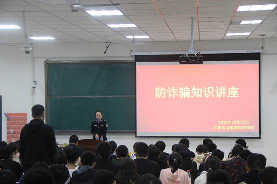 讲座邀请新城区公安局张政委担任主讲。讲座中,张政委以实际案件为例,历数了一些常见的网络诈骗招数,如利用QQ盗号、网络兼职刷单诈骗、网络购物诈骗、网上中奖诈骗、安全账户诈骗等。