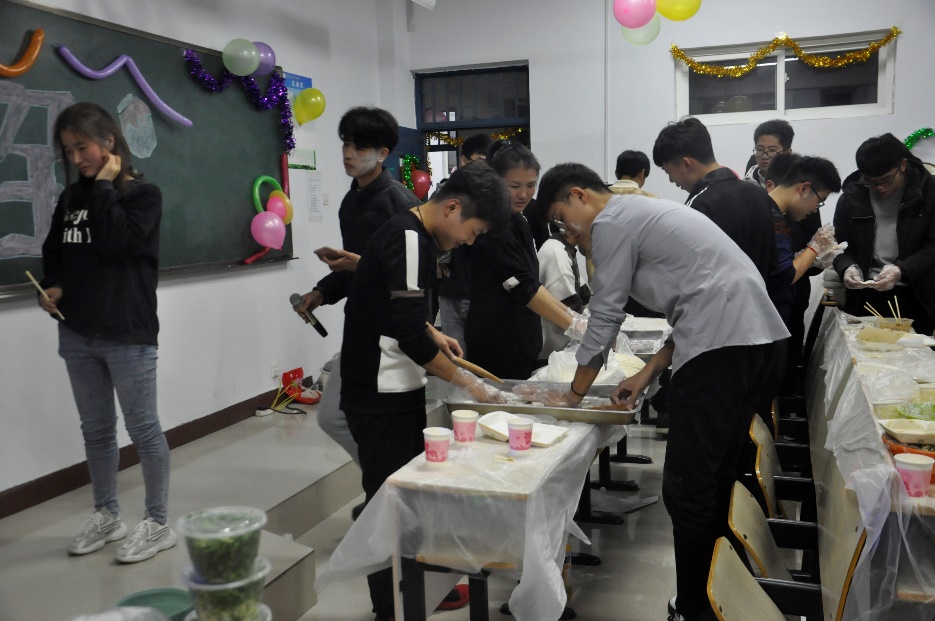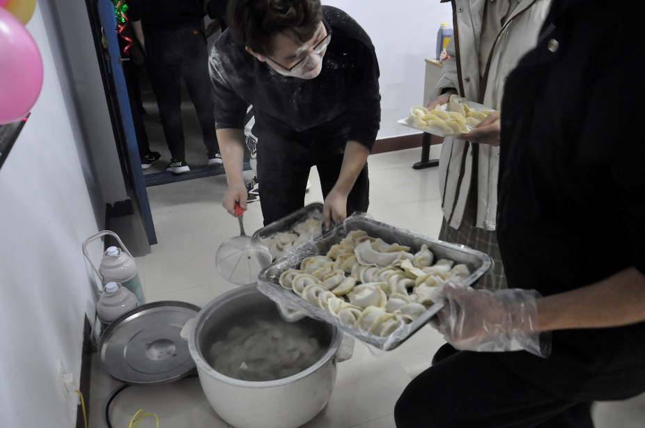 活动前,各班同学发挥想象力装饰自习室,并积极准备各项活动所需材料。接着,在各班班委的组织下,各班同学纷纷撸起袖子,投入“包饺子”工作中。调酱料、揉面团、擀皮、包馅、煮饺子,大家热情高涨、积极参与,分工协作,配合默契。同学们一边包饺子,一边交谈,教室里不时传出阵阵笑声。经过两个多小时的忙碌,一只只形态各异、别具一格的饺子摆满了盘子,“大厨”们可谓是将想象力与创造力发挥到了极致。最后,一盘盘热气腾腾的饺子纷纷出炉,大家一边品尝自己的劳动成果,一边欣赏同学们的才艺表演,浓浓饺子香使人忘却了冬日的寒冷。