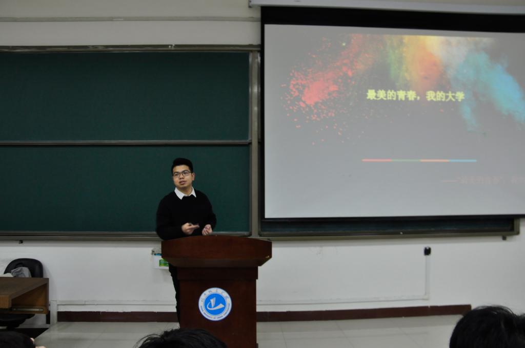 首先上台发言的是陈启昆,他从规划目标、热爱生活、树立自信、学会感恩四个方面与同学们进行讨论。通过分享自身的学习生活经历,陈启昆呼吁同学们树立强大的自信心,乐观的面对老员工活,积极地解决自身存在的问题,学会感恩,做一个知恩图报的人,规划好自己的大学之路。