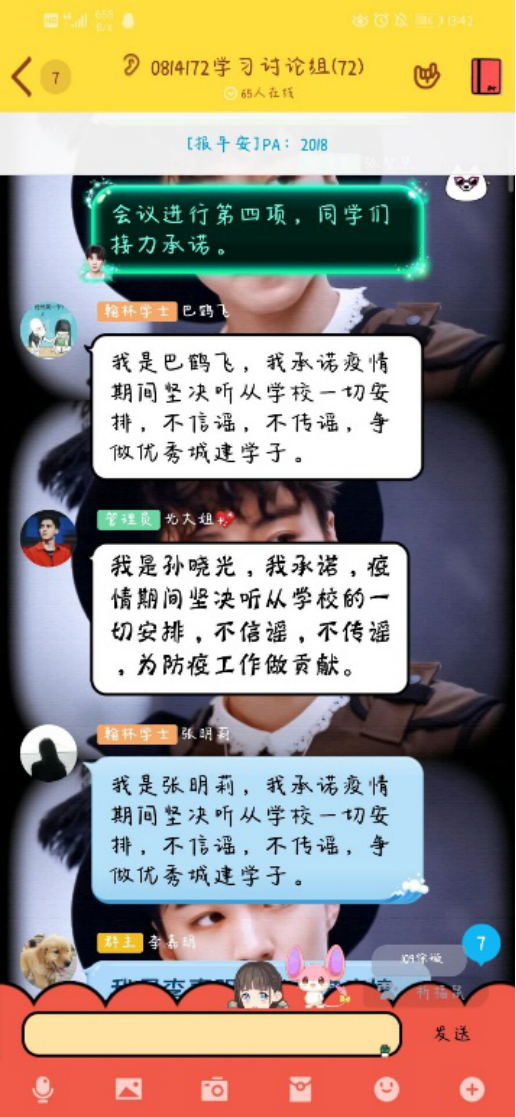 此次防疫主题线上会议由各班团支书主持。活动开始,各班团支书组织同学们观看疫情相关新闻,借助视频讲解疫情的相关情况,并提出防疫倡导,引导同学们在家做好防疫工作。接着,团支书呼吁大家发表自己的意见,同学们积极参与,热烈讨论,踊跃发表自己的意见。活动最后,团支书进行简要总结并督促同学们上交会后反思。