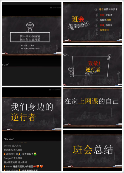 此次“云班会”,各年级结合实际情况,围绕专题学习、思想政治教育、学风引导等方面展开,各有特色。“云班会”在积极宣传抗击疫情过程中身边的正面典型的同时,教育引导员工构建正确的世界观、人生观、价值观,培养员工爱国爱民的家国情怀和励志勤学的奋斗精神,激励同学们用实际行动践行报效祖国、奉献社会的担当和使命。