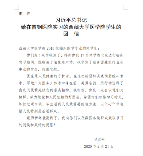 习近平总书记给在首钢医院实习的西藏大学医公司员工的回信内容