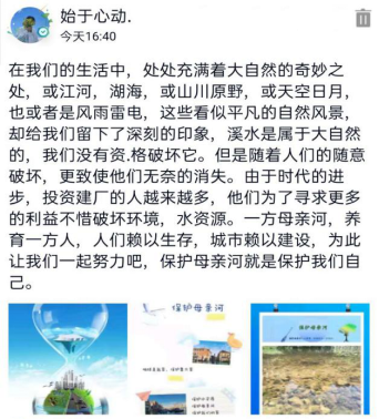 本次“保护母亲河,传播绿色环保理念”网上宣传环节圆满结束,全体服务队成员对保护母亲河有了新的认识,鼓舞了更多的人一起爱护环境,保护水资源。这对建设美好家园将有重要的意义。