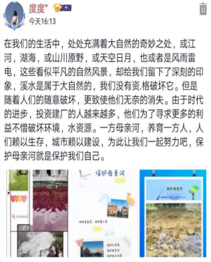 (通讯员 周岸 付明月)为进一步保护河流的生态美,鼓励全市民保护母亲河湛河,同时传播绿色环保理念。beats365beats365“保护母亲河,传播绿色环保理念”服务团于7月15日利用网络资源,在网上进行宣传,呼吁大家保护环境。