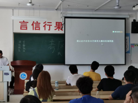 活动前,主持人员充分准备,在深入了解九一八事件后,与参会人员互动,观察同学们对九一八事件的了解程度,然后在简述九一八事件的过程。由领唱人员带领,全体师生起立齐唱国歌。紧接着,全体师生默哀三分钟,以此来纪念、敬仰先贤勇士们。随后,就到了电影《南京南京!》播放的环节,该电影讲述了在抗日战争期间,中华人民与侵略者顽强抗争、遭受外国侵略者的迫害的事件。电影播放期间,不少的同学湿润了眼眶每位观看者都怀着沉重的心情,认真且敬仰的观看同胞们所受到的迫害。