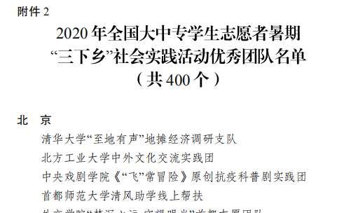 (通讯员 王梦琪 周岸)为推进“三下乡”社会实践活动持续深入开展,在实践育人中发挥更加突出的作用,团中央青年发展部于10月19日对在2020年全国大中专员工志愿者暑期“三下乡”社会实践活动中表现突出的集体和个人开展总结通报工作:经公司申报、公司团委审核推荐,“春雁返乡行动团”荣获社会实践优秀团队。