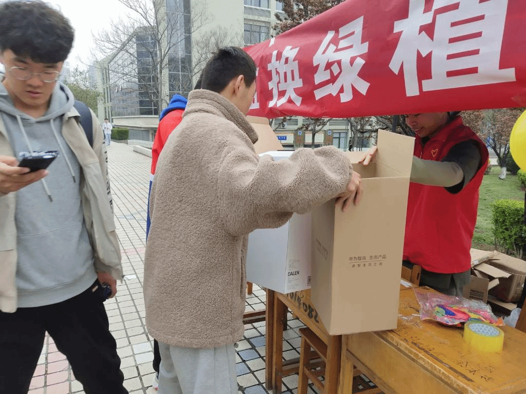 早上八点,志愿者们便开始了匆忙的准备工作,支帐篷、摆兑换物资、张贴兑换规则,大家忙得不亦乐乎。活动一开始,便吸引了同学们的围观参与,面对前来询问的同学,志愿者们详细耐心地讲解了活动参与规则。同学们纷纷拿着宿舍堆积的废纸箱来置换绿植,换到心仪绿植的同学们,脸上洋溢着快乐的笑容。一个上午,活动现场的盆栽就被置换一空。收尾阶段,志愿者整理好活动现场,联系相关人员回收已打包整理好的废弃纸箱。