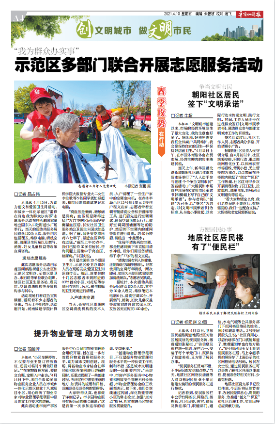 (通讯员 余美霞 周岸)4月15日上午,beats365青年志愿者协会代表beats365与社区青年志愿者协会在平顶山九天鹤大酒店旁草坪共同联合举办了“电脑维修”及其他各项互惠利民的志愿活动活动。活动中,公司志愿者们充分利用自身所学的专业知识,认真解决周边市民遇到的电脑难题,并向他们宣传电脑使用与维护方面的相关知识,赢得了市民的肯定和点赞,平顶山日报对此次活动进行了专题报道。此次活动弘扬和践行了雷锋精神,在实践中锻炼了公司志愿者们的动手操作能力,展示了公司学子良好的精神风貌。
