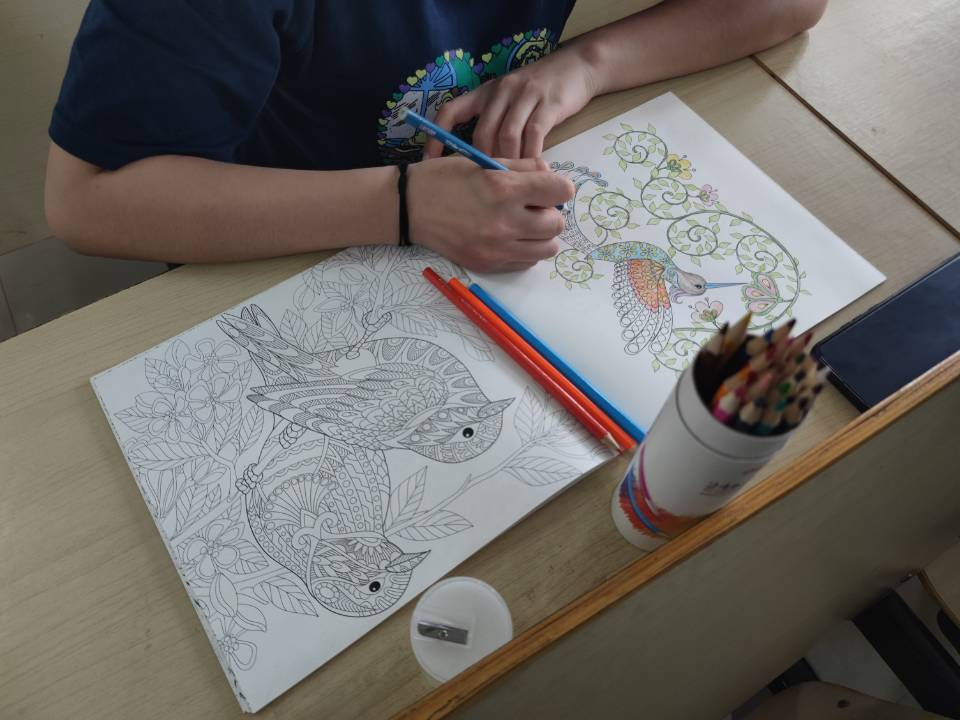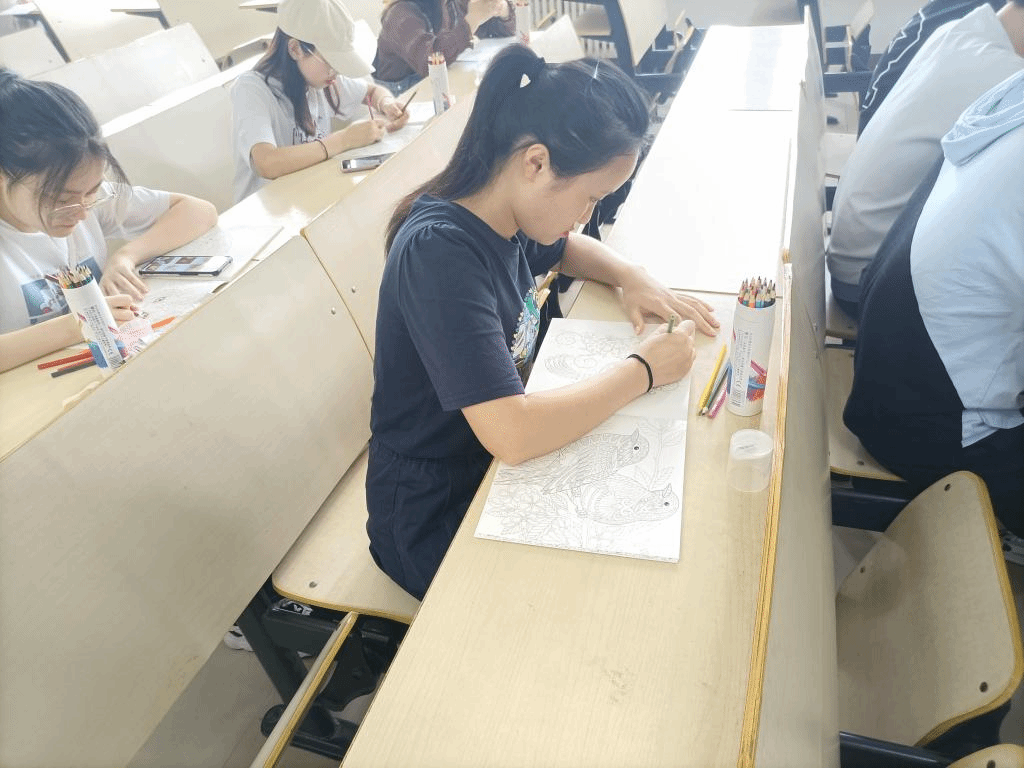 在活动中,同学们积极参与,公司为同学们准备了“秘密花园”手绘本等绘画材料。同学们在绘画上色完成后,依次上台阐述自己选择这幅作品的原因以及内心的所思所想。填涂环节,同学们认真思考绘画本上所要填涂的颜色,一笔一画思索万千,专心致志的将心中的答案填涂在绘画本上。现场的气氛也变得十分安静,只有绘画笔在画本上发出沙沙的声音。分享阐释环节,同学们积极发言展示,将自己填涂的作品用美妙的语言展示给大家,同学们认真聆听,现场一片活泼。