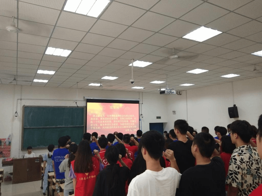仪式开始后,员工代表李慧如上台发表自己对暑期“三下乡”活动的认识,并呼吁志愿者们共同协作,不怕困难,艰苦奋斗,争取将更多的温暖与知识带到乡村去。接着,指导老师王占洲在仪式上作安全教育讲话,叮嘱志愿者们在“三下乡”活动举办期间,一定要注意自己的财产与人身安全,不单独行动,不脱离团队,在保证安全的情况下努力积极完成实践任务。随后,员工代表带领着志愿者们一起宣读了宣誓词,慷慨激昂的宣誓,表现出了志愿者们无畏困难,在实践中发挥不怕吃苦,从群众中来到群众中去,无私奉献的志愿精神。最后,李宝宏给“三下乡”团队授旗,表达对“三下乡”团队的衷心祝愿,和对此次活动的成功举办的信心。仪式结束后,大家合影留念。