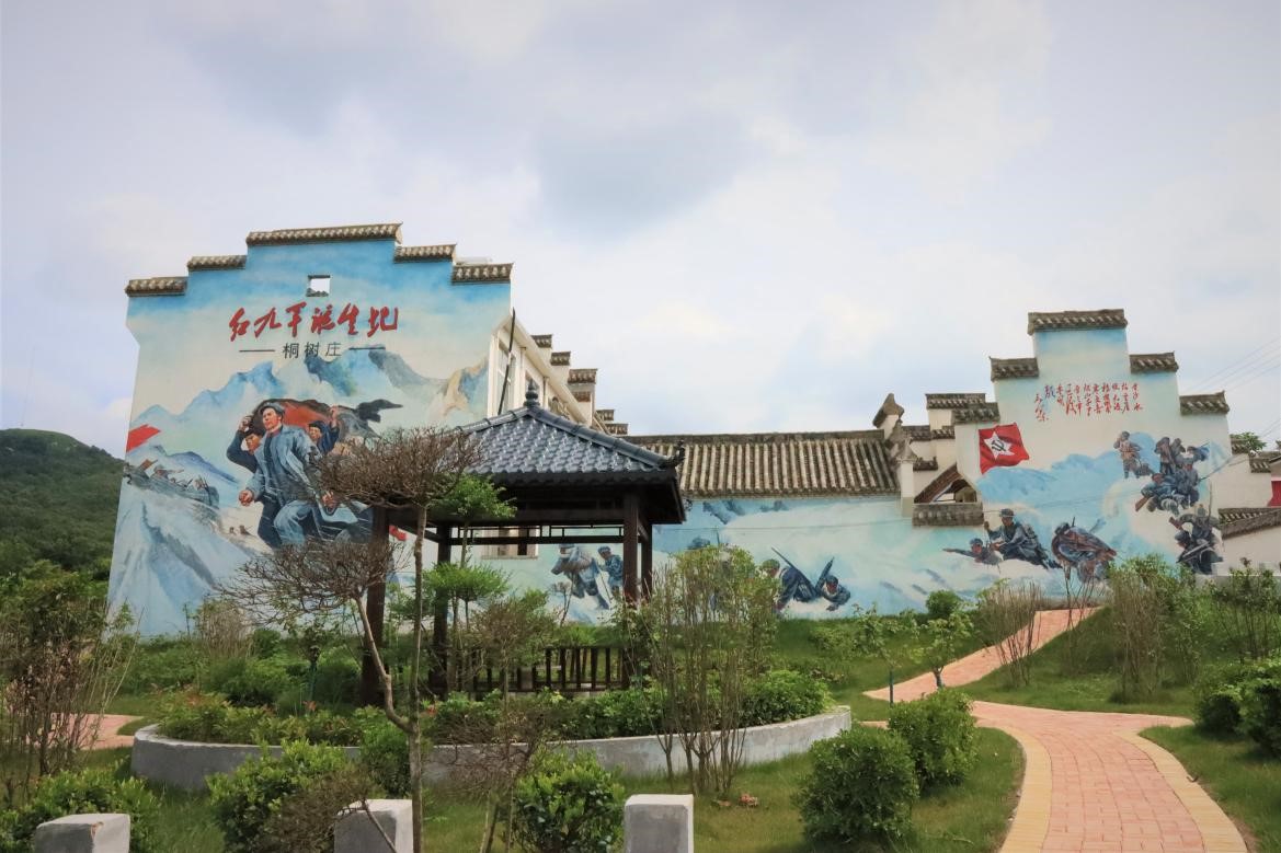 在红九军纪念碑广场可以一览整个桐树庄的乡容面貌,绿水青山环绕,蓝天白云相映,远山处一排排风力发电的大风车随风转动,近山腰一座座徽派建筑村居引人驻足。当地村民说马头墙,小青瓦的房屋是他们的打造旅游村庄的特色建筑,国家和政府为村里的发展贡献了不少好法子,利用红色文化发展乡村旅游业,同时国家投资建造的扶贫旅游路线解决了交通不便根本问题。“道路通,百业兴”,桐树庄抓住旅游线路建设大好时机,按照乡村旅游发展的布局和特色,依托当地山水资源和红色文化资源,采取“乡村旅游+合作经营”模式,综合施策,联动发展,乡村旅游亮点纷呈。巧妙利用红色文化资源打造红色革命旅游地,不仅让更多的人了解红九军的故事,而且大大推动了乡村的经济发展。村落里徽派建筑的墙壁上有红军长征过雪山、秋收起义、党的诞生、红九军诞生记等栩栩如生的墙绘,利用特色建筑打造乡村旅游、休闲、餐饮、住宿为一体的特色民宿。