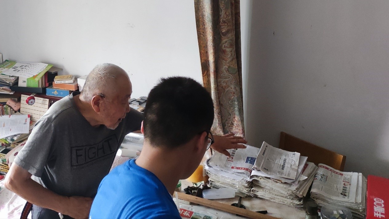 走进周爷爷家后,入目便是丰富的书籍,报刊。房间的装饰与现代装饰相差甚远,可以看出周爷爷的生活是艰苦朴素的,周奶奶几年前因病去世,家中仅有周爷爷一人生活,周爷爷的子女均在别的城市发展。周爷爷因不愿在别的城市安家,便一直居住在曾一直工作的城市—平顶山,平顶山这座城市对周爷爷有着特殊的意义,周爷爷在退休前是平顶山煤矿业的机电工人,在这里经历了人生的起起伏伏。