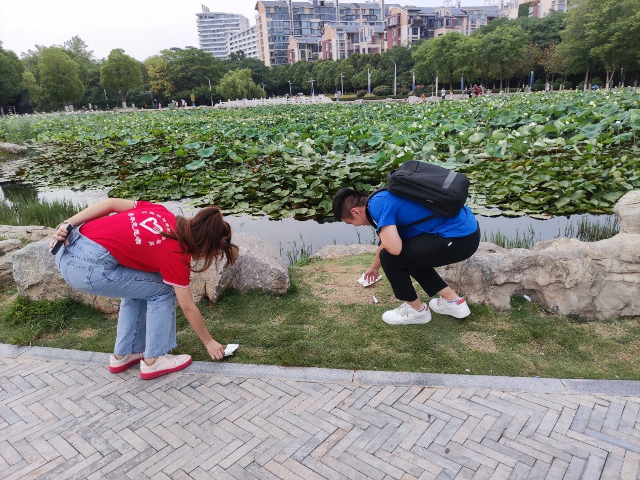 图为志愿者们捡拾路上垃圾,同学们各尽其力(通讯员 李子龙 摄)