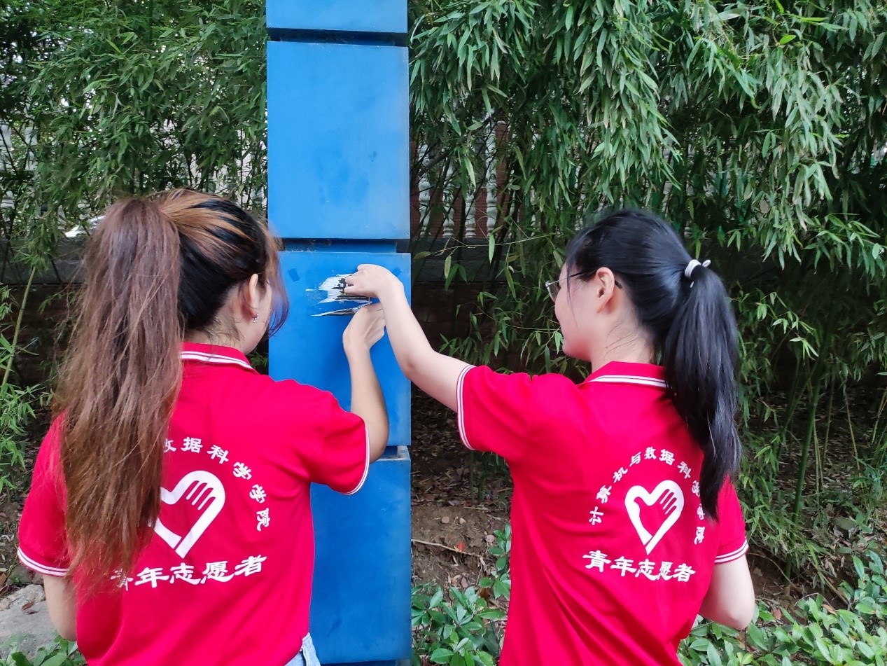 图为志愿者们清理广告贴,同学们仔细清理(通讯员 李子龙 摄)