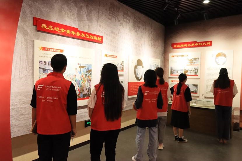 同学们带着崇高的敬意进入纪念馆,映入眼帘的是“红色段庄 革命城堡”四个大字,能立刻感觉到被红色的革命精神包绕。馆内收藏了大量文物,有军事用品、资料文献、历史照片,更有栩栩如生的壁画将部分革命场景真实地呈现出来。“我爷爷段风和是段庄党支部第一任书记,他曾只身前往许昌,从国民党哨兵手中夺枪,他被害的时候只有31岁。”58岁的段军峰党龄32年,他说:“没有他们那一辈共产党人艰苦奋斗,哪会有我们现在的生活?”段庄党支部第二任书记段永胜在狱中双眼致残,出逃后还带领群众武装借粮,此事数年后被记载在《莽原》上,段庄革命斗争也被赞为 “秋天里的春光”。新中国成立前,段庄约有村民140户,其中68户都是革命家庭,约500人的村子,90%以上都是赤色群众。打土豪、抢武器、成立抗日游击队、建立叶县独立团、参与中原突围…… 在段庄党支部的带领下,这里英雄儿女辈出,他们勇往直前、为民族独立、人民解放做出了贡献,段庄也由此被誉为红色革命堡垒。