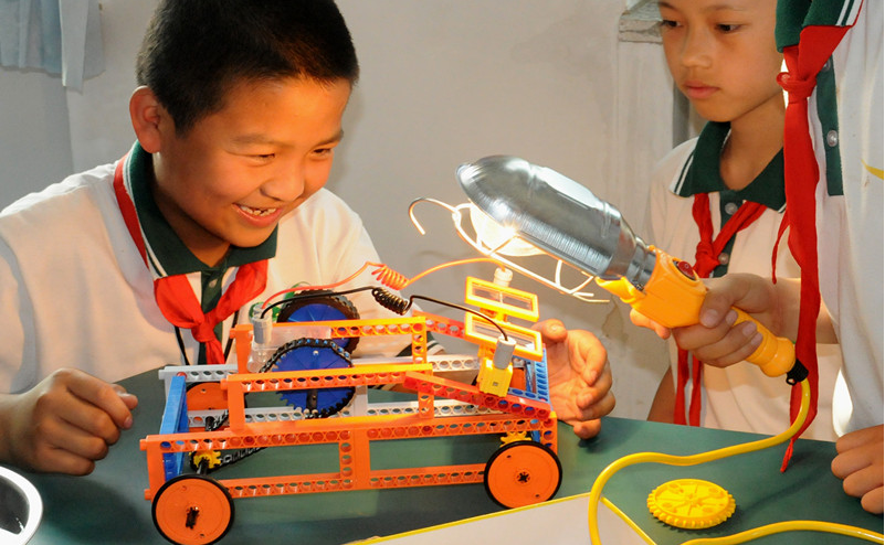 图为正在认真在做实验的小朋友们