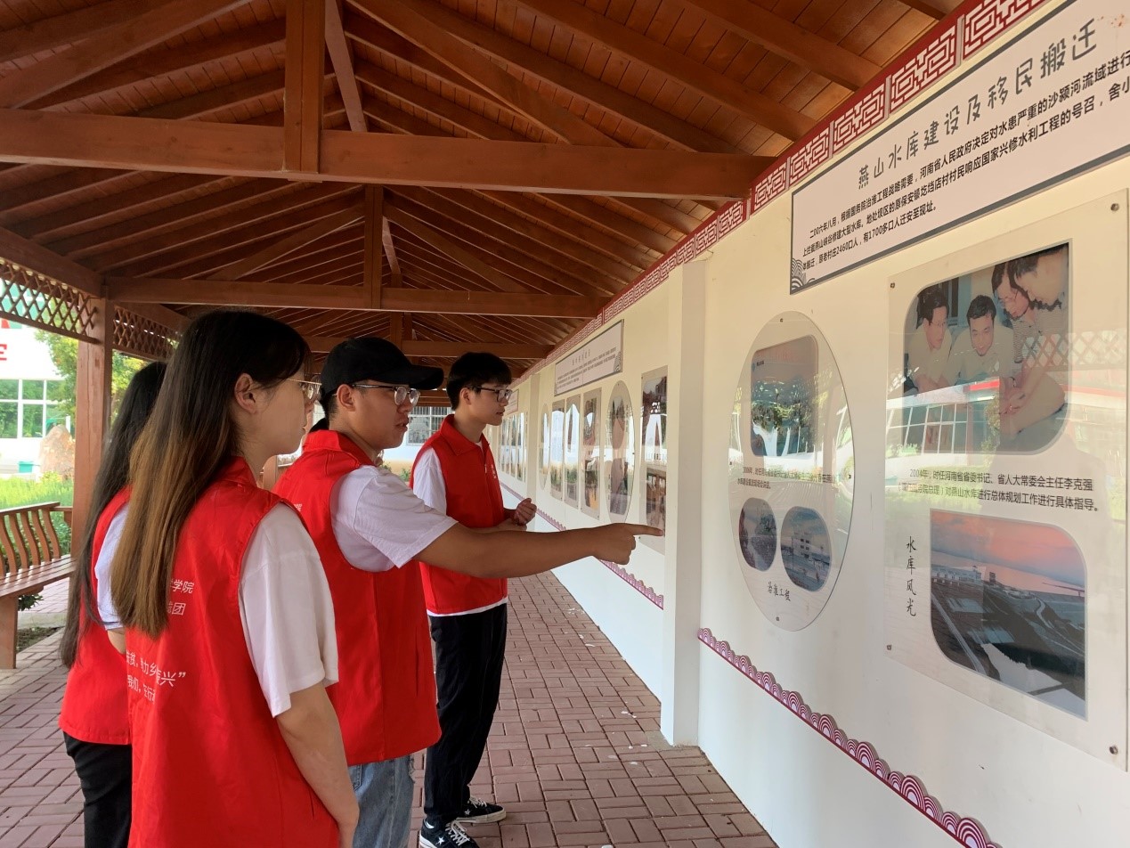 2006年8月,根据国务院治淮工程战略需要,河南省人民政府决定对水患严重的沙颍河流域进行治理,在干江河支流上拦截燕山峡谷修建大型水库,圪垱店村村民为了响应国家号召,建设美丽乡村,舍小家顾大家,实施了整体搬迁。在叶县移民局和昆阳办事处的大力支持下,近几年来,上级陆续在圪垱店移民新村投资600多万元,建设中心办公楼、小学教学楼、文化广场和沿河公园,村外粮田也全部新打了机井,水泥路修遍了田间地头。7月9日实践团队通过参观访问移民村史长廊,了解到新村规划建设。圪垱店村老村房屋多为砖瓦房,土坯房,且道路坑洼不平,环境较差,生活贫困,如今道路宽敞,房屋排列井井有条。特色种植示范园内种有韭菜,迷迭草,月季,芦笋等。为了增加移民收入,村“两委”积极引导群众调整种植业结构,选准高端蔬菜芦笋种植项目,目前,全村种植芦笋1200多亩,为周边群众提供200个就业岗位。随后圪垱店移民新村干部向实践团队员介绍圪垱店村的历史以及发展情况,由生活贫困到如今的生活幸福,习近平总书记说:“青年一代有理想有本领有担当,国家就有前途,民族就有希望。”圪垱店村干部表示:“感谢国家的乡村振兴战略,基于此,农民如今才会过上美好的生活,青年一代更是要拼搏奋斗,你们这个老员工群体正是国家的希望。”