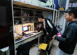 任恒与郑征在菊园8号男生公寓看望走访员工,在走访中两位老师针对同学们反映的宿舍维修,近期教学安排等问题进行了现场处理与解答。