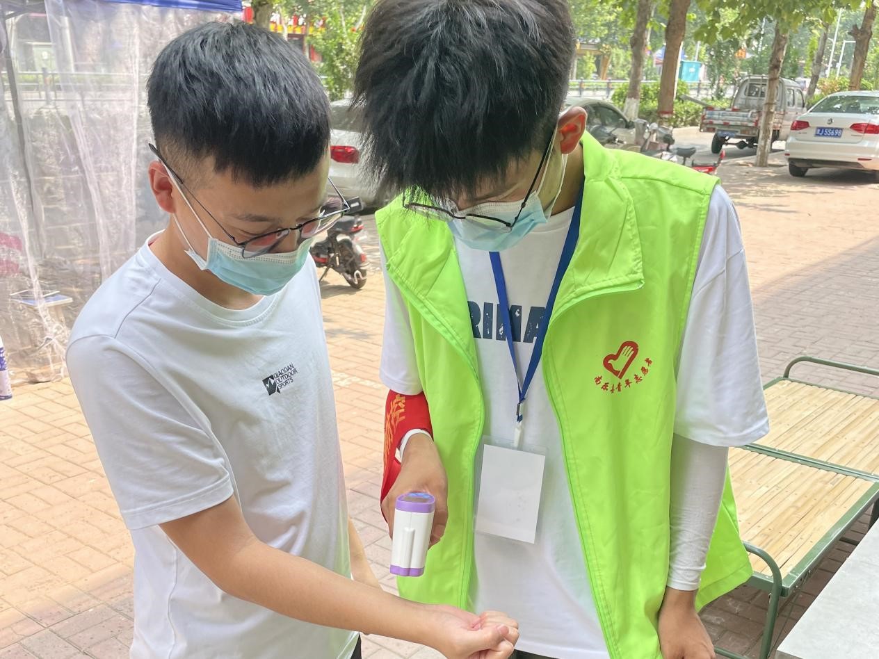 图为志愿者进行测温工作