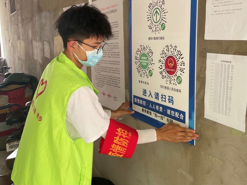 图为志愿者正在粘贴两码