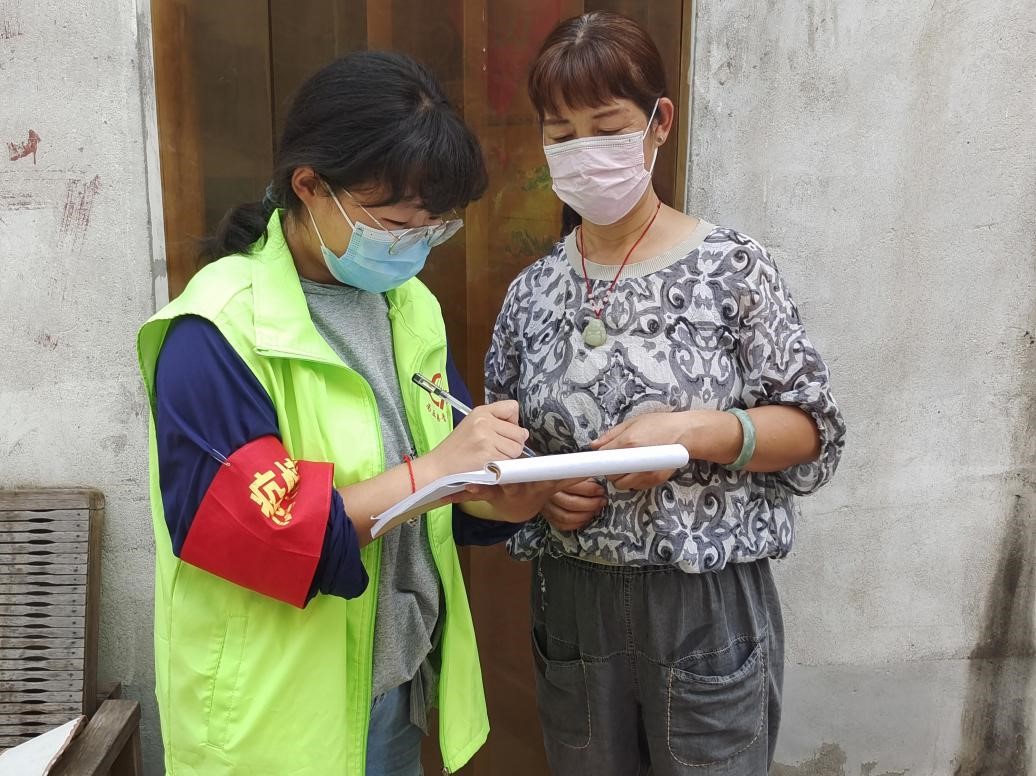 图为志愿者上门登记返乡居民信息