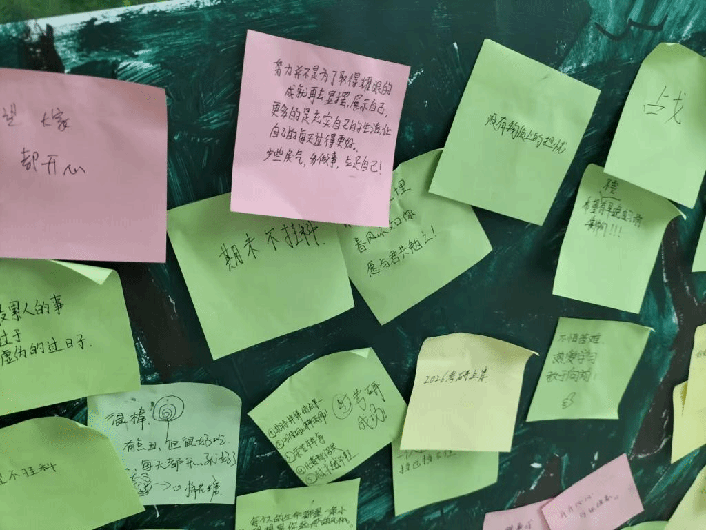 活动中,心理协会、青年志愿者协会志愿者在景观大道和教学楼等地为过往的同学们发放便利贴,供大家书写自己的心愿与烦恼。并制作成展板放在10号楼大厅以供大家观看浏览,帮助同学们缓解压力、放松情绪、展望未来。