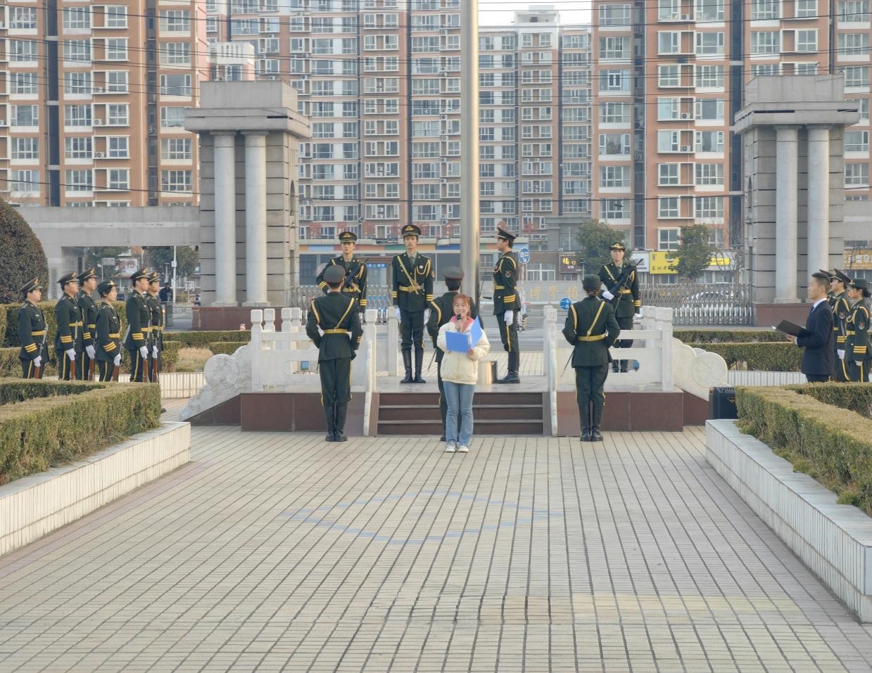 清晨六点半,参加升旗仪式的师生整齐列队,庄严肃穆迎接国旗。六点四十,随着国旗护卫队步伐坚定,脚步整齐划一的声音,升旗仪式开始。升国旗奏国歌,全体师生行注目礼,鲜艳的国旗在《义勇军进行曲》的歌声中缓缓升起,整个广场顿时洋溢着肃穆庄严的氛围。国旗迎风飘扬,国旗下公司员工代表韩雪冰讲到“青春须早为,岂能长少年”的名句,把青春的奋斗与拼搏融入国家发展中,为实现中华民族伟大复兴的中国梦贡献自己的力量。